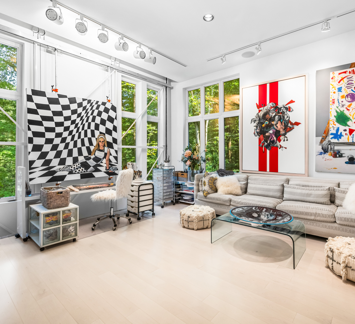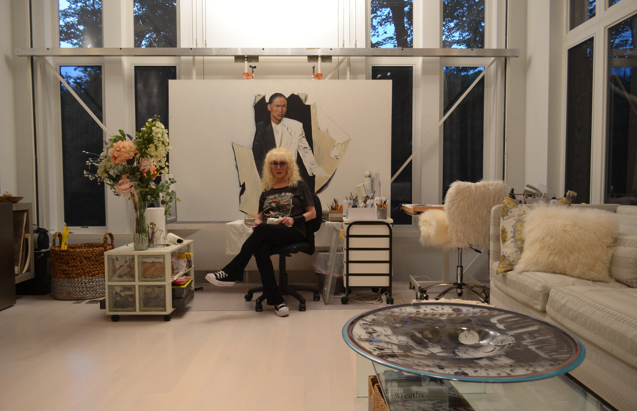 This unique easel, conceived by Sherry Wolf herself, features a slot in the studio floor to accommodate a motorized structure, enabling the canvas to move up and down seamlessly at the push of a button. This ingenious setup significantly enhances her efficiency while offering unprecedented flexibility and precision in her artistic process. It epitomizes an ideal fusion of functionality and creative freedom, making it a dream come true for any artist. This creation is a clear reflection of Wolf’s commitment to innovating within her workspace, ensuring that her environment is as dynamic and capable as her artistic vision.