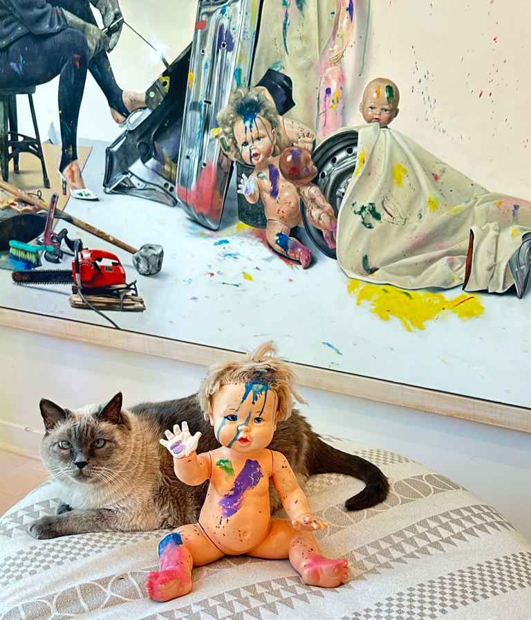 Sherry Wolf’s studio stands as a vibrant testament to her innovative spirit and unwavering dedication to her craft. It is notably equipped with a custom-designed easel, a revolutionary tool that significantly enhances her approach to working on large canvases. This bespoke piece of equipment underscores her commitment to pushing the boundaries of traditional artistic methods, allowing her to execute her vision with unprecedented precision and ease. The studio, much like her art, reflects Wolf’s continual pursuit of excellence and innovation in the dynamic world of contemporary art.